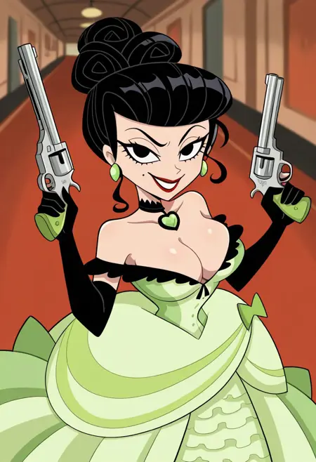 Ouffit: 小さな薄緑色のイヤリング、羽と花で飾られた薄緑色の帽子、深く開いたネックラインの長い薄緑色のビクトリアンドレス、長い黒手袋、緑のハートがついた黒いネックレス、長いタイトな黒ストッキング、黒いハイヒール