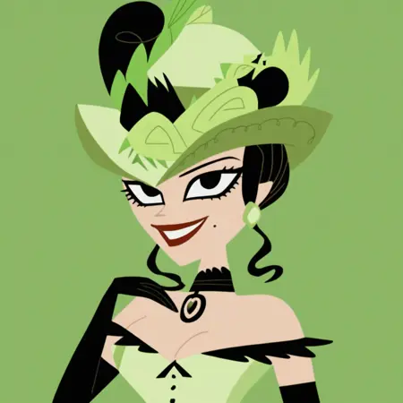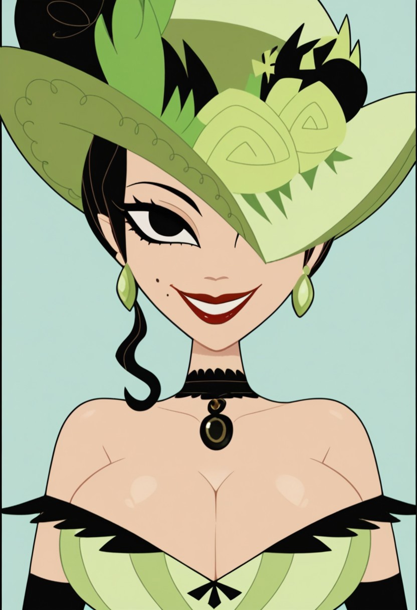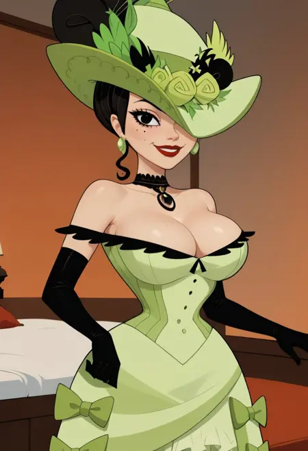 Ouffit: small light green earrings, light green hat decorated with feathers and flowers, long light green victorian dress with a plunging neckline, long black gloves, black necklace with a green heart, long tight black stockings, black heels
