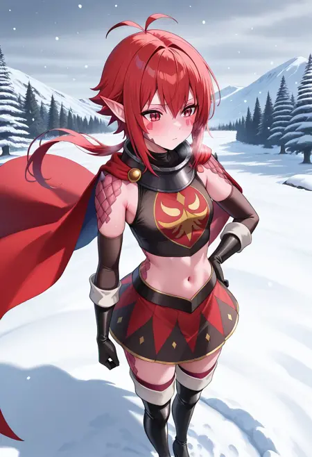 タグ: Karst_GS、ドラゴンガール、ピンク肌、顔の模様、赤い目、とがった耳、赤髪、前髪、長めの髪が付いたショートヘア、サイドロックス、ポニーテール、アンテナ髪、喉の甲、裸の肩、うろこ、とがった突起、マント、赤いマント、クロップトップ、プリントシャツ、お腹、へそ、ミニスカート、プリントスカート、手袋、肘まで Gloves、絶対領域、太ももブーツ、とがったブーツ