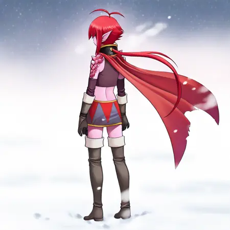 태그: Karst_GS, 드래곤 소녀, 분홍색 피부, 얼굴 무늬, 붉은 눈, 뾰족한 귀, 빨간 머리, 앞머리, 긴 머리카락이 있는 단발, 옆머리, 단발머리, 천선 머리, 목갑, 어깨 노출, 비늘, 돌출부, 망토, 빨간 망토, 크롭 탑, 프린트 셔츠, 허리, 배꼽, 미니스커트, 프린트 스커트, 장갑, 팔꿈치 장갑, 젯타이 루잉키, 허벅지 부츠, 뾰족한 부츠,