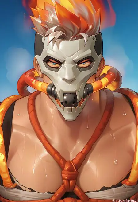 1boy, buffmeg@don, muscular, fiery hair, mask, armor, armored fingerless gloves, pants, boots,