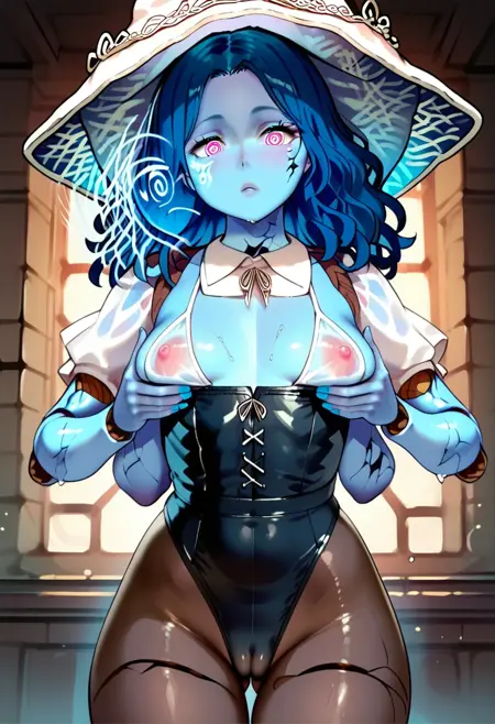 4 arms, multiple faces, blue skin, colored skin,cracked skin, extra faces, witch hat, doll joints,