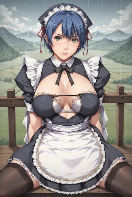 short hair, green eyes, blue hair, large breasts, hair ribbon, dress, frills, black thighhighs, white gloves, miniskirt, puffy short sleeves, maid, clothing cutout, maid headdress, short dress, frilled skirt, lace trim, breasts apart, maid apron, center opening