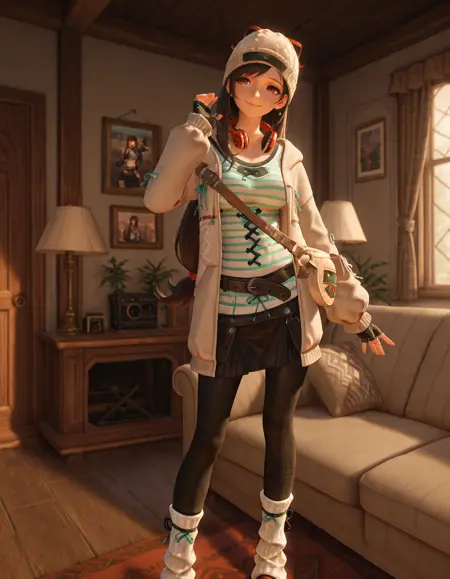 Cozy Adventurer outfit, beanie, blue stripped shirt, jacket, long sleeves, belt, skirt, fingerless gloves, black pantyhose, leg warmers, shoulder bag, headphones