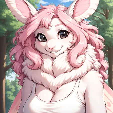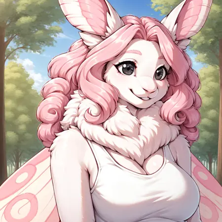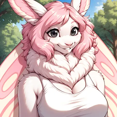 Anthro, moth, Sarah the moth(character), female, pink hair , neck fluff, black eyes,