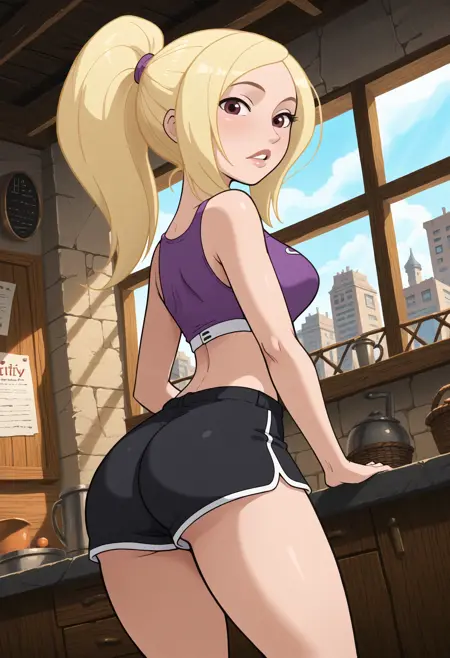 主要标签:1girl,单人,金发,长发,马尾辫,露脐,肚脐,短上衣,短裤,黑色鞋子,袜子