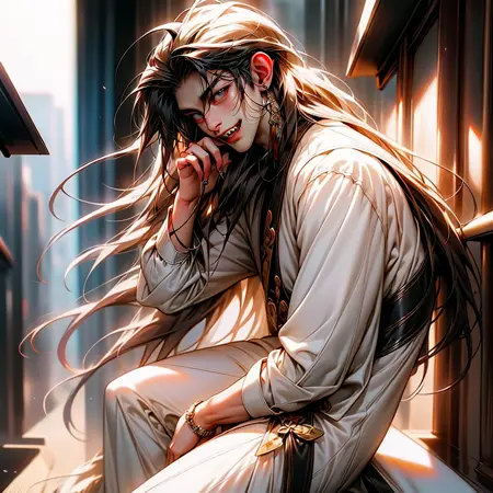 focus类触发词:tongue out, letterboxed, portrait, blood on face, blood, jewelry, open mouth, teeth, extra ears, chain, virtual youtuber, black choker,cat ears, , bishounen, eyes visible through hair,tattoo, black shirt, formal, fur trim, forehead mark, piercing, head tilt, blurry, light particles,turtleneck, air ornament,scar on face, wet hair, looking back