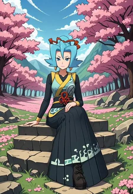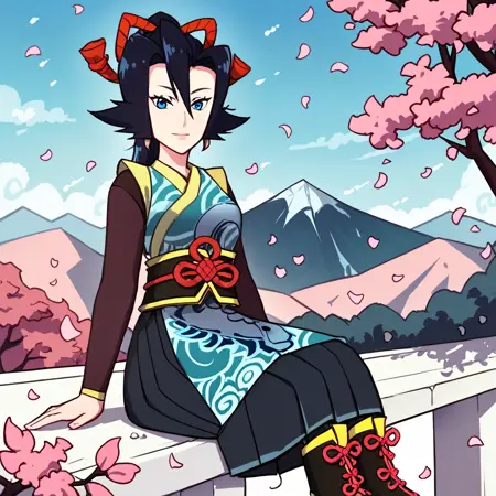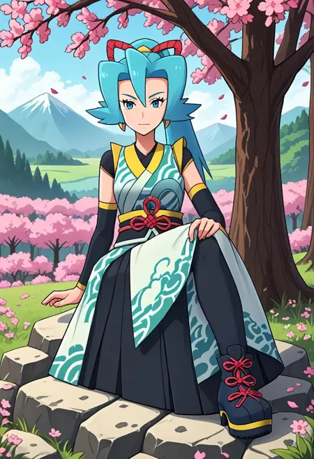 nyclair, nycla, clair_\(pokemon\), blue_eyes, aqua_hair, ponytail, hair_ribbon, japanese_clothes, hakama, very_long_dress, detached_sleeves, boots, black_footwear, red_laces,