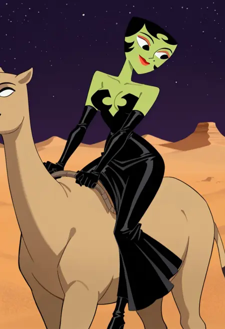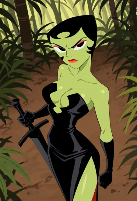 1girl, Solo, Ikra_SJ, green skin, black hair, black eyes, red lips, very short vintage hair, small black mole on cheek, big eyes