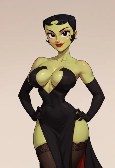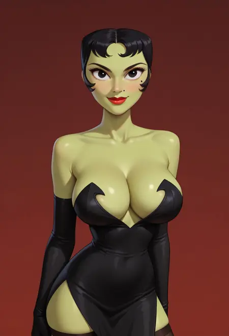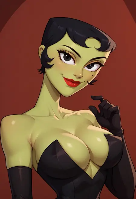1girl, Solo, Ikra_SJ, 緑の肌, 黒い髪, 黒い目, 赤い唇, 非常に短いヴィンテージ風の髪, ほほにある小さな黒いほくろ, 大きな目