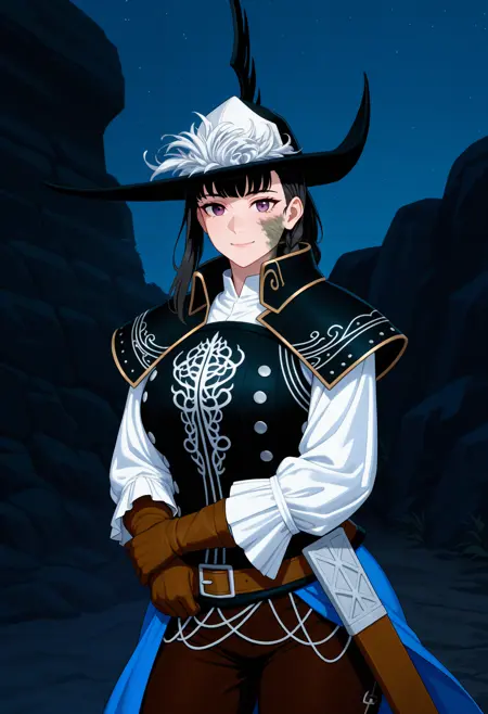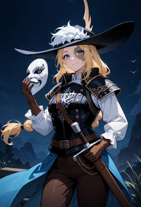 盔甲标签: 黑色帽子、羽饰、帽羽、面罩、黑色胸甲、白色衬衫、长袖、肩甲、腰披、蓝色披风、棕色手套、棕色腰带、棕色长裤、靴子、棕色鞋履