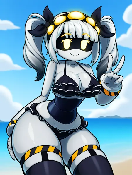 j \(murder drones\), medium hair, white hair, grey hair, blunt bangs, bangs, twintails, hair bow, hair ornament, legwear garter, hazard stripes, black over-kneehighs,
