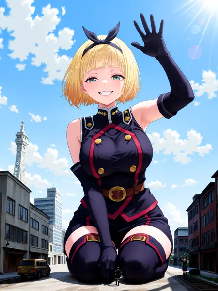 black military uniform, elbow gloves, brown belt, black shorts, thigh boots