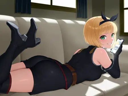 검은 군복, 팔꿈치 장갑, 갈색 벨트, 검은 반바지, 허벅지 부츠
