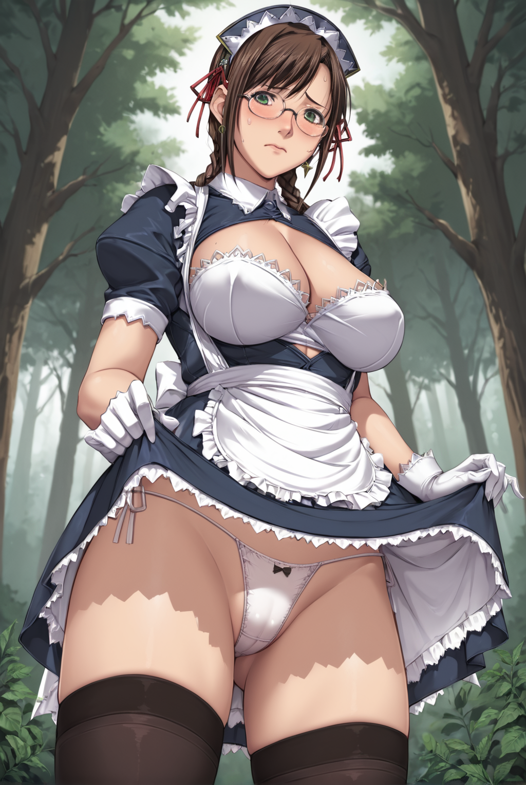 long hair, brown hair, green eyes, twin braids, large breasts, skirt, dress, ribbon, cleavage, hair ribbon, earrings, frills, glasses, black thighhighs, white gloves, maid, clothing cutout, maid headdress, short dress, cleavage cutout, maid apron