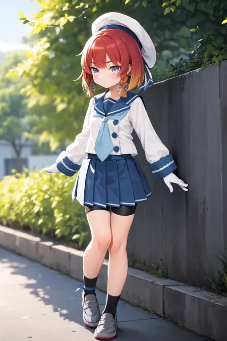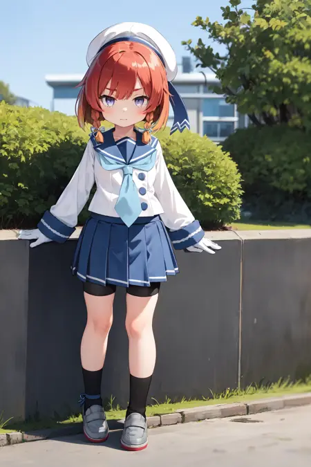 Outfit : school uniform, serafuku, white headwear, sailor hat, blue neckerchief, blue ribbon, hair ribbon, white gloves, blue skirt, pleated skirt, shorts under skirt, black shorts, black socks, grey footwear,