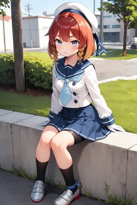 복장: 학교 유니폼, serafuku, 흰색 머리장식, 해군 모자, 파란 넥커치프, 파란 리본, 머리 리본, 흰 장갑, 파란 치마, 주름 치마, 치마 아래 반바지, 검은 반바지, 검은 양말, 회색 신발,