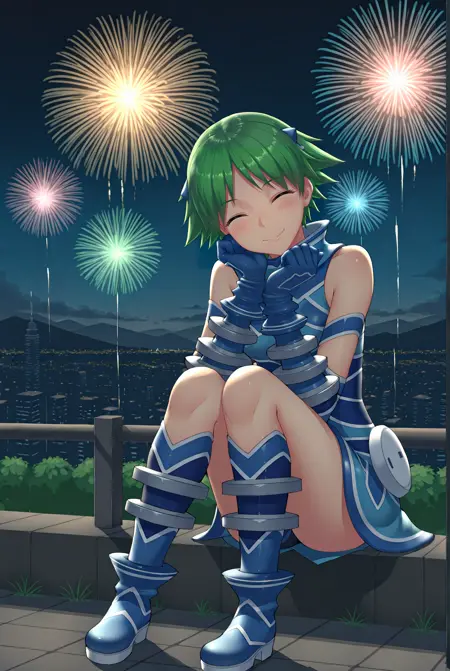 1girl, n4tsume, n4tsume_dress, solo, short hair, green hair, closed eyes, smile, r1ng_gloves, green hair, r1ng_boots