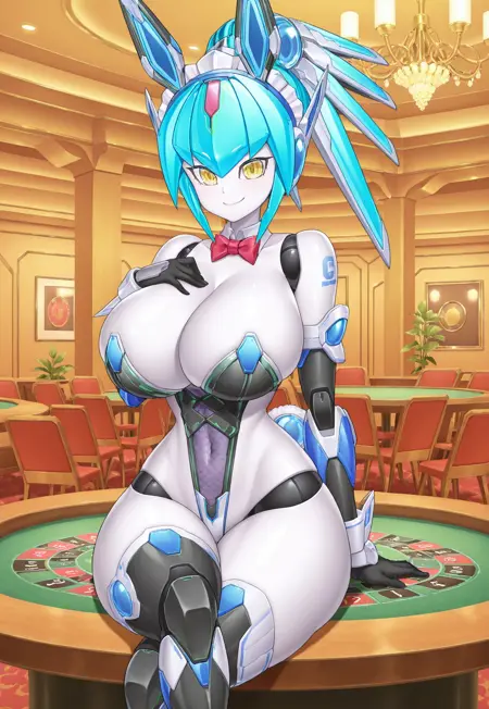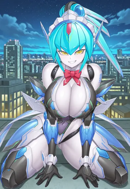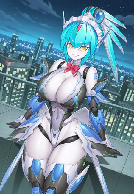 タグ:アンドロイド、メカニカル、セクシー、曲線美、アルネーテス\(Taimanin\)、メイドヘアースタイル、高いポニーテール、アイボリー色の髪、黄色い目、色付き肌、グレー肌、大きな胸、谷間、細いウエスト、広い hips、太ももが太い、メカ娘、