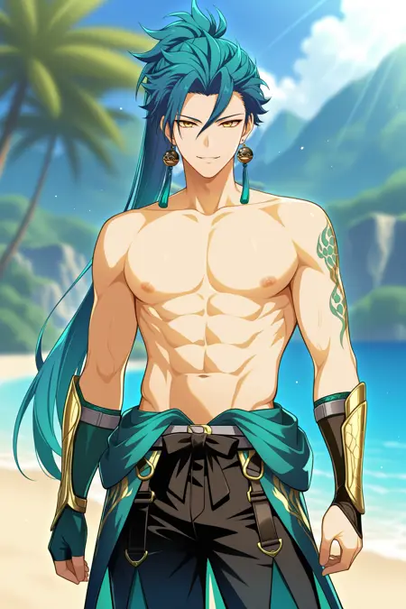 jiyan_wuwa, green hair, long hair, high ponytail, yellow eyes, low ponytail