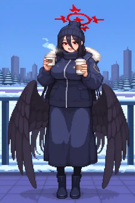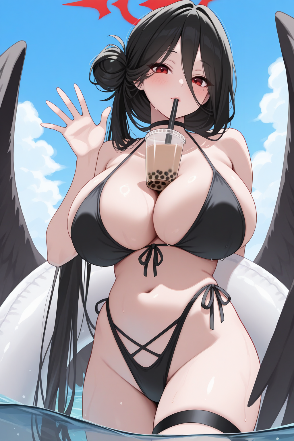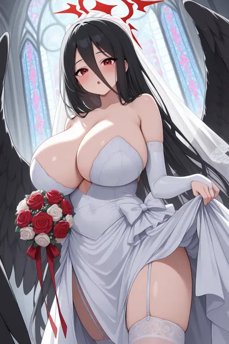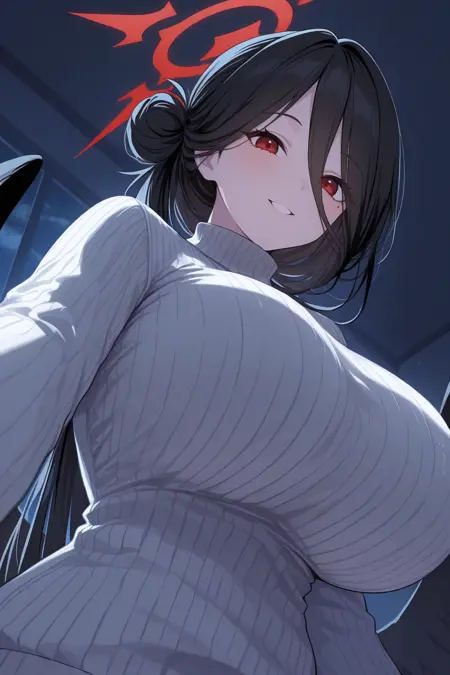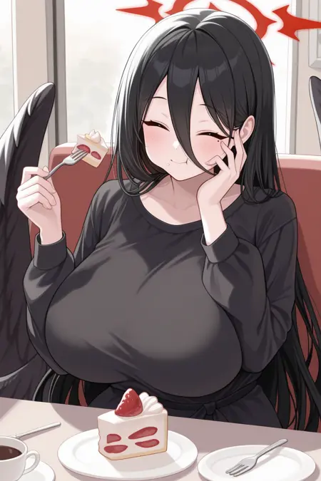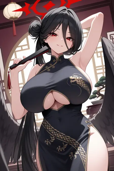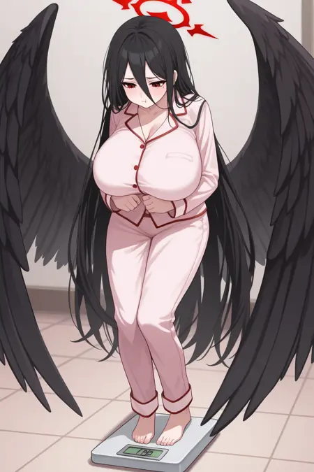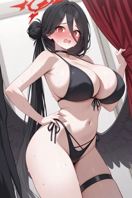 외모: hsmhnkw, 거대한 가슴, 눈 밑 주근깨, 붉은 환영, 낮은 날개, 큰 날개, 검은 날개, 붉은 눈, 검은 머리카락, 눈 사이의 머리카락, 매우 긴 머리카락