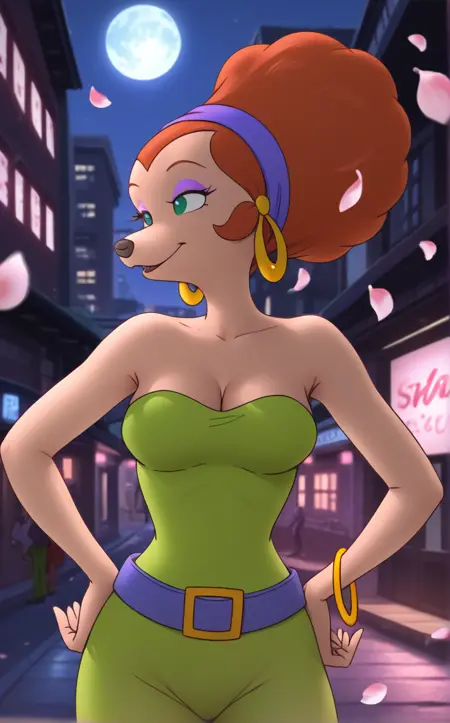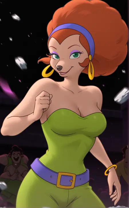 GreenDressAfro_SylviaMarpole_ownwaifu, 1girl, animal nose, dog girl, furry female, green eyes, jewelry, orange hair, snout, bare shoulders, hoop earrings, makeup, short hair, purple hairband, afro, purple eyeshadow, sidelocks, cleavage, strapless dress, big hair, medium breasts, green dress, purple belt, lipstick, bangle, headband, green pants, strapless, curly hair, belt, collarbone, breasts, eyelashes, belt buckle, sleeveless, earrings, gold bracelet, gold earrings, hair ornament, hair ribbon, large breasts, loose belt,