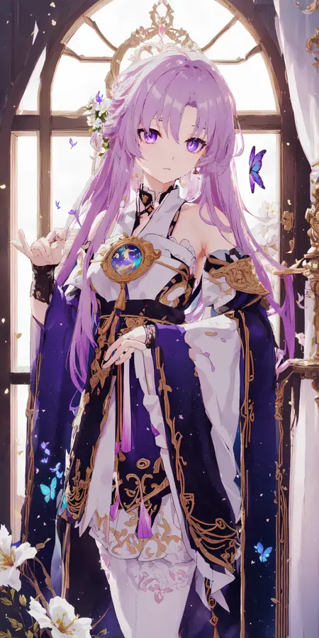 建议关键词:bangs, long hair, pink hair, purple hair, jewelry, hair ornament, yellow eyes, pink eyes