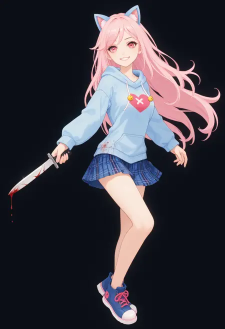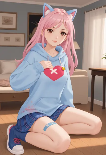 主要な衣装タグ: フーディー, 青いフーディー, フード, フードを下ろした状態, 長袖, スカート, チェック柄, チェック柄スカート, プリーツスカート, ハート, 青い靴下, 青い靴, バンドエイド, 脚のバンドエイド、