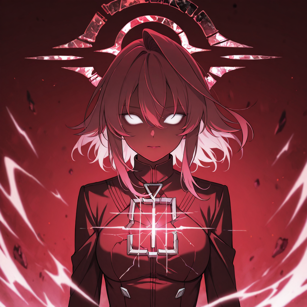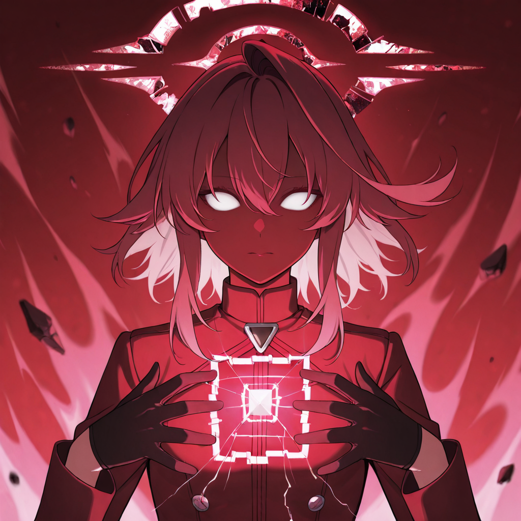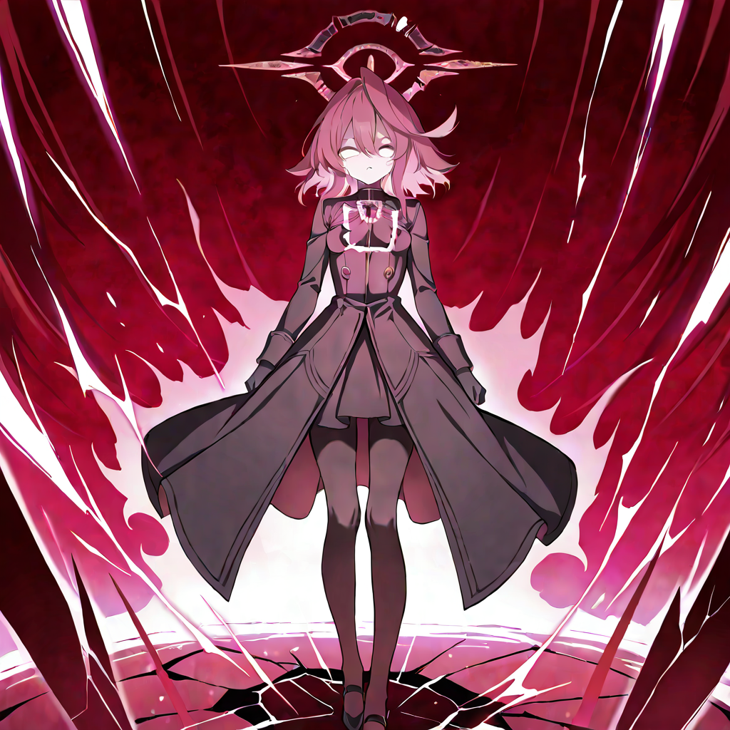 hoshino_terror,1girl,pink hair,red hair,hair between eyes,medium hair,white eyes,no pupils,tears,broken halo,red halo,red theme,aura,light on chest,black gloves,black coat,black pantyhose,black skirt,black footwear,small breasts,