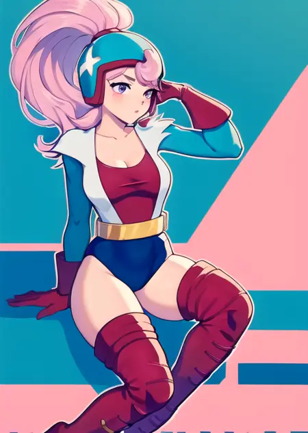 Default skin: helmet, red gloves, blue leotard, star (symbol) , thigh boots , cleavage, belt, red footwear, shirt, long sleeves, ponytail,