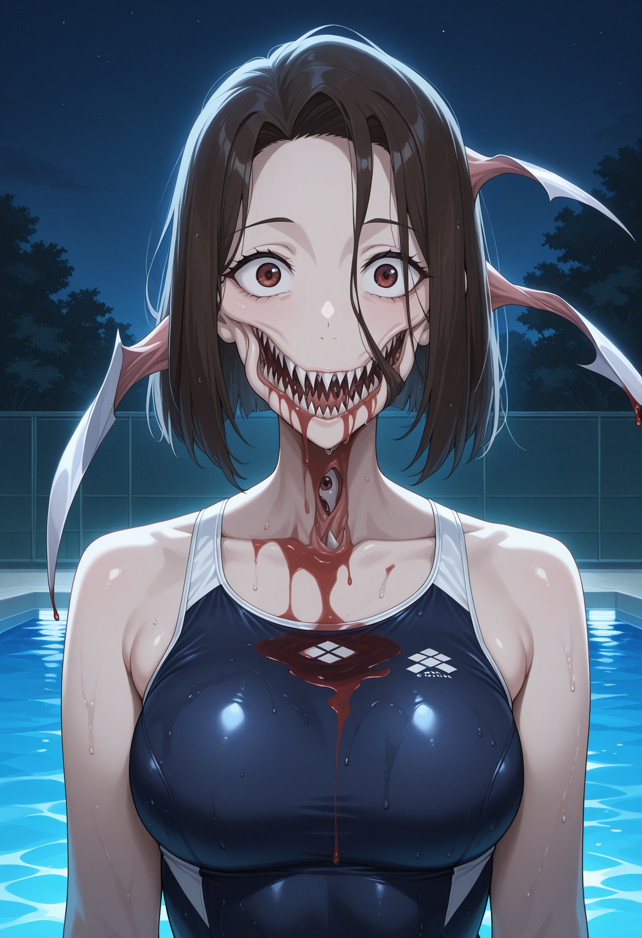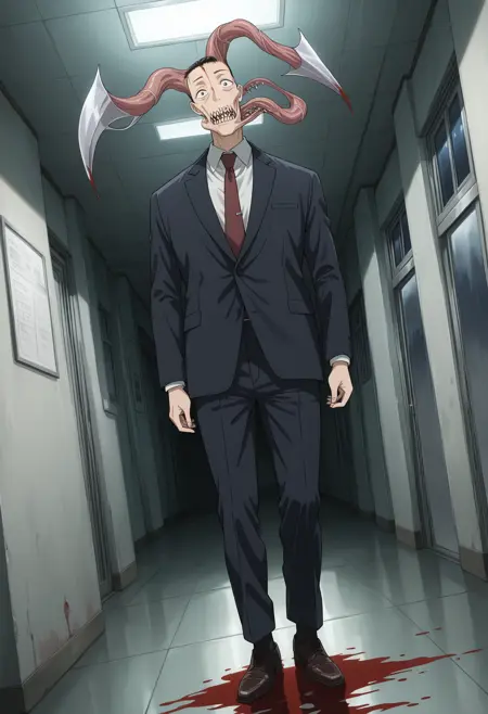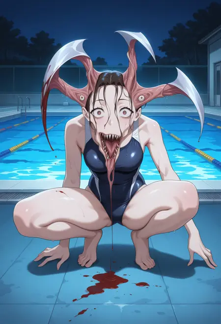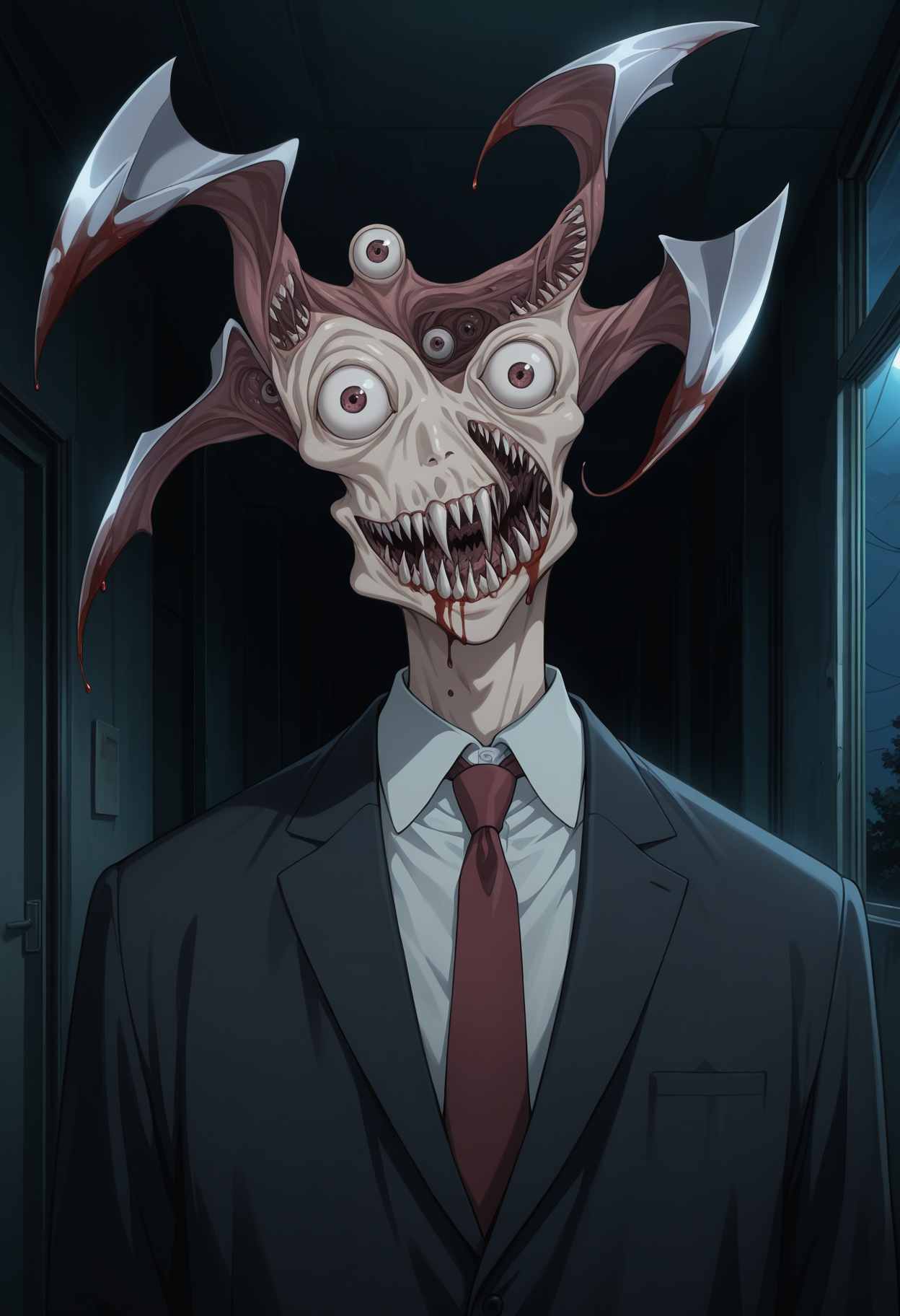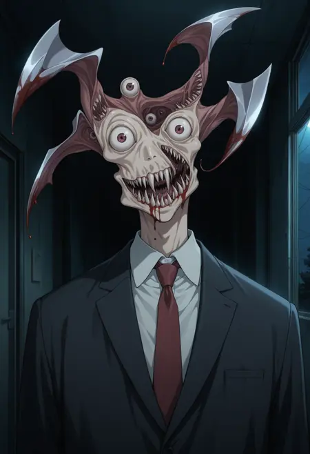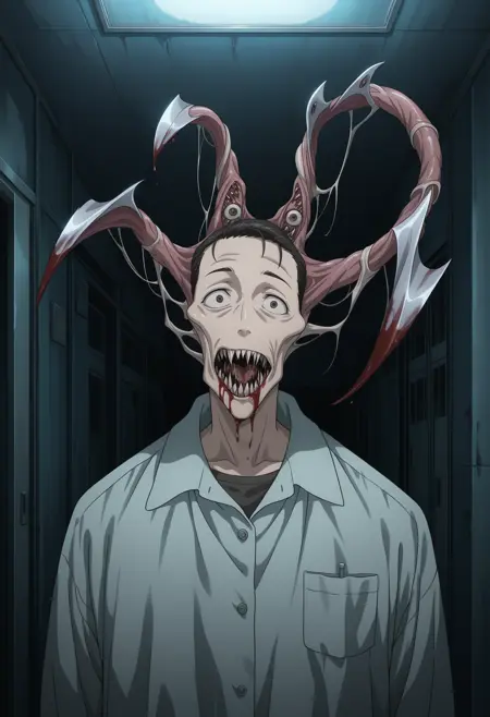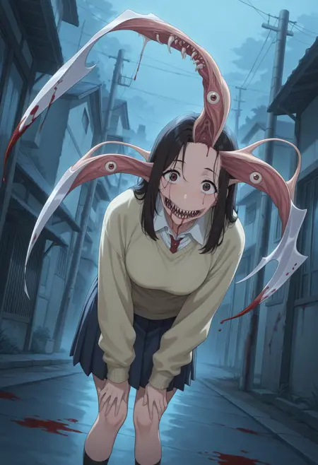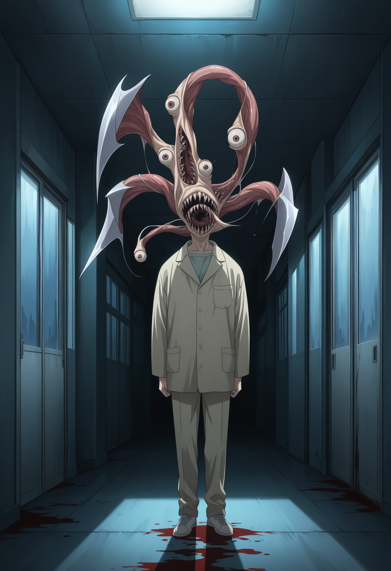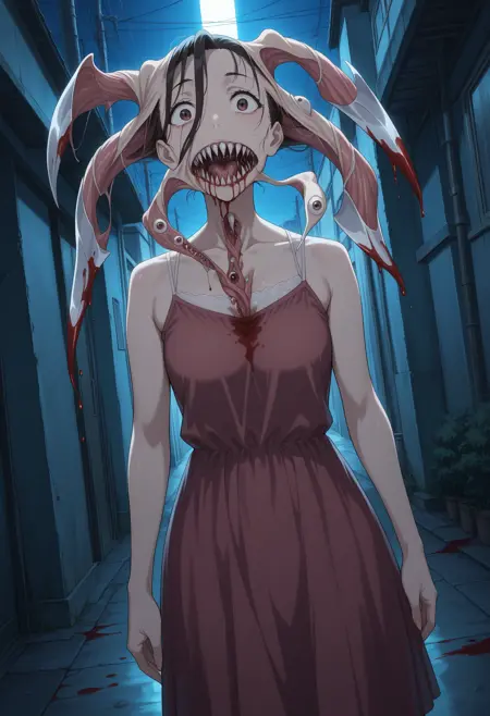 masterpiece, absurdres, highres, newest, 1girl, c-parasyte, night, looking at viewer, dutch angle, blood, blade, dark, horror, indoors,