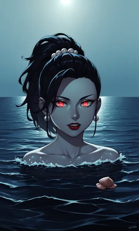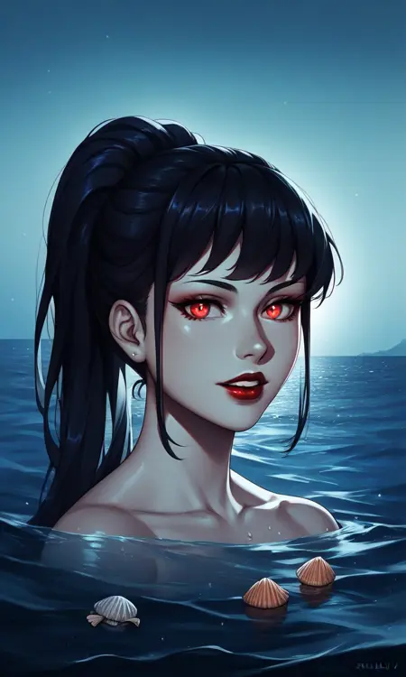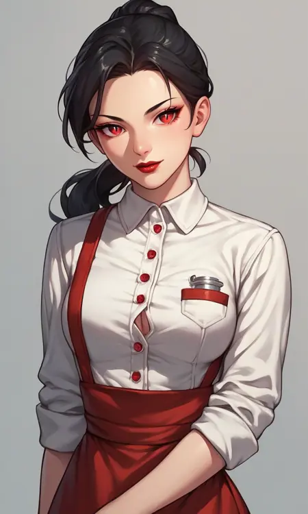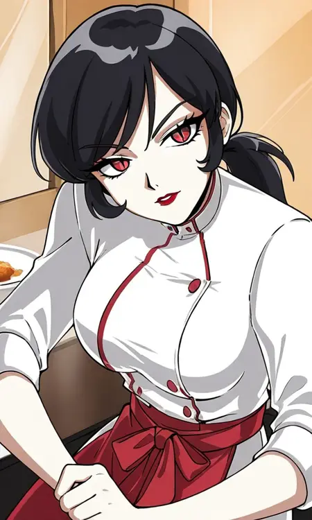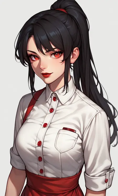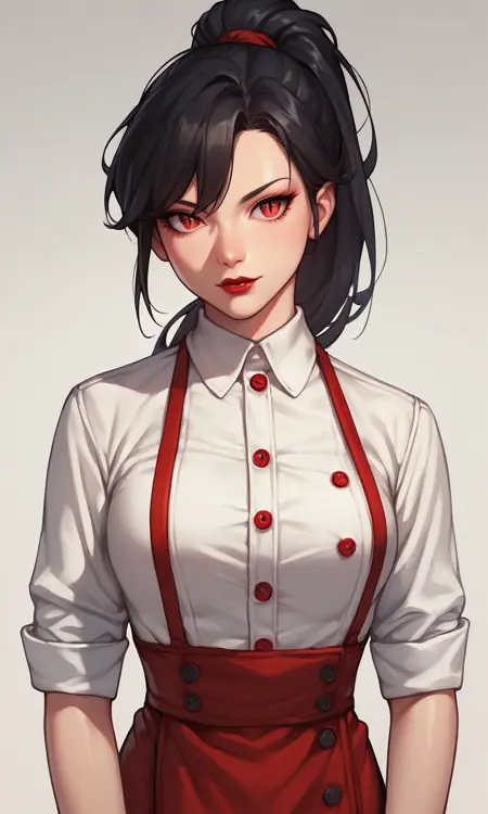 1girl,ponytail,black hair,red eyes,red lips,chef uniform,red apron,white shirt,buttons,slit pupils