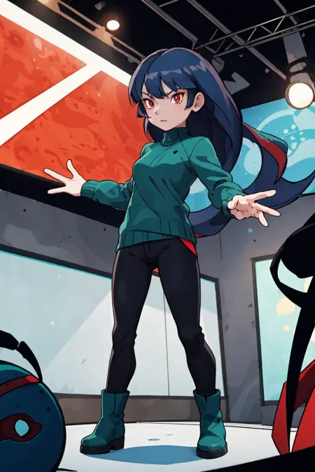 ジェネレーション1/2/FRLG: ブラックのボディスーツ、黒髪、赤スカート、赤シャツ