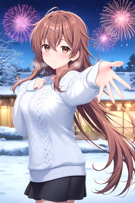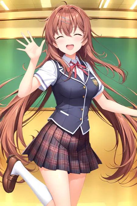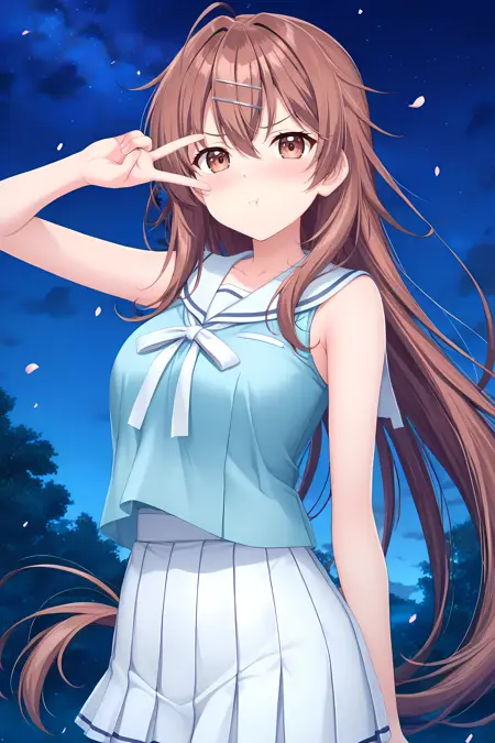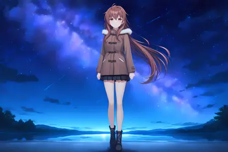 オタクコンベンション衣装(これは非常に不安定です。基本のプロンプトを削除してこれに置き換えてください): Aisa,茶色の髪,長い髪,茶色の目,ヘアクリップ,髪飾り,アホ毛,前髪,眉間の髪,オタクAisa,タイツ,ツインテール,ハイツインテール,白いリボン,手袋,短めの袖,黒いタイツ,紫のスカート,リボン,指なし手袋,紫のシャツ,ゼッタイリョウイキ,黒い手袋,ふわふわの短めの袖,ミニスカート,シャツ,お腹,フリル,