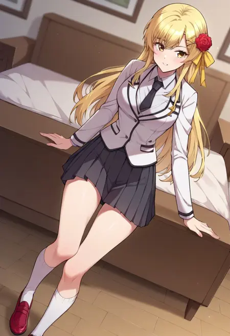 1girl,clanass,solo,blonde hair,long hair,bangs,hair ribbon,yellow ribbon,socks,red shoes,red flower on shoes,school uniform,white blazer,white shirt,collared shirt,black skirt,long sleeves,pleated skirt,jacket,black necktie,pantyhose,hair ornament