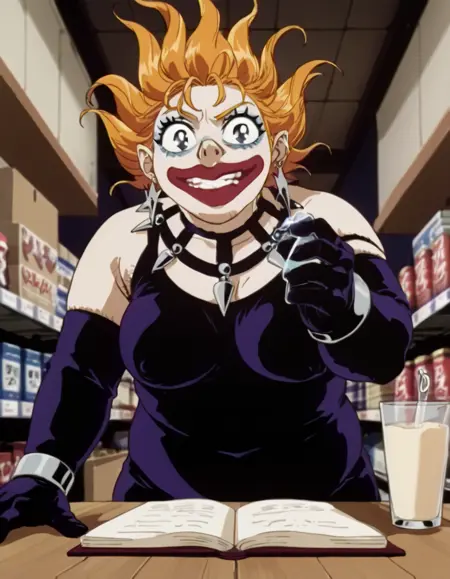 Hamuko is a grotesquely captivating figure, a monstrous mini-giantess with clown-like features, her twisted allure combining exaggerated femininity with horrifying intent.