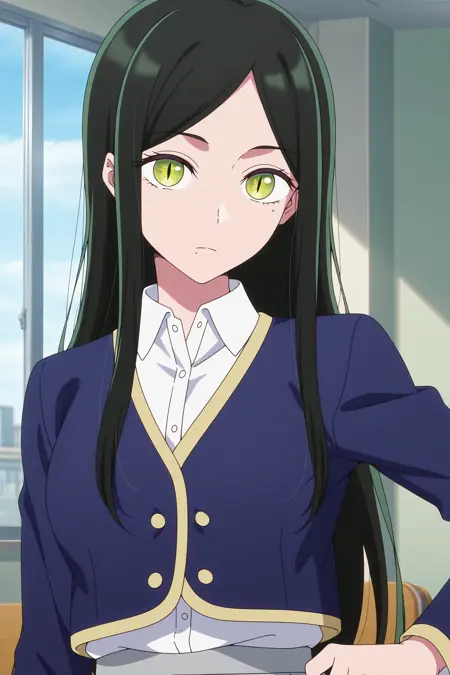 shiranui frill, long hair, green hair, sidelocks, parted bangs, green eyes, slit pupils, mole under eye, mole under mouth, long sleeves, blue jacket, cropped jacket, white shirt, collared shirt, grey skirt, white socks, kneehighs, brown footwear, loafers