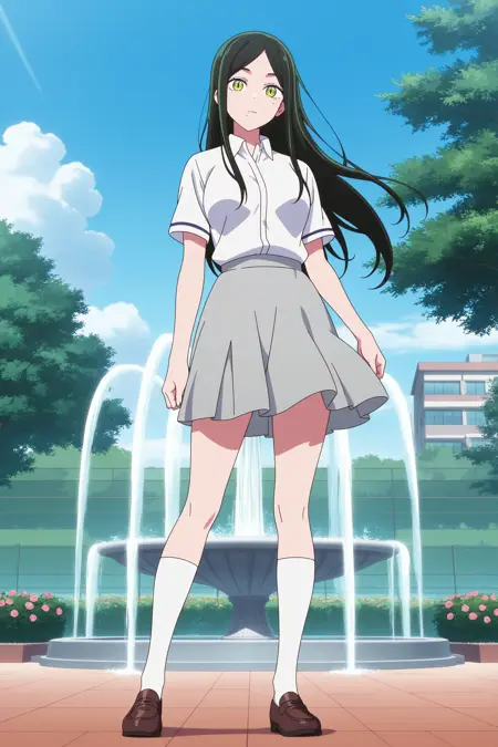 shiranui frill, long hair, green hair, sidelocks, parted bangs, green eyes, slit pupils, mole under eye, mole under mouth, short sleeves, white shirt, collared shirt, grey skirt, white socks, kneehighs, brown footwear, loafers