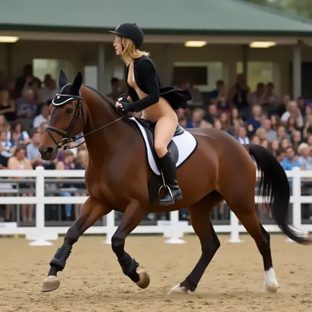 RiHorse, side_view, a slim nude girl riding a galloping horse.... The girl wears ...