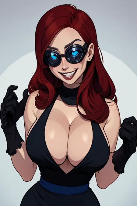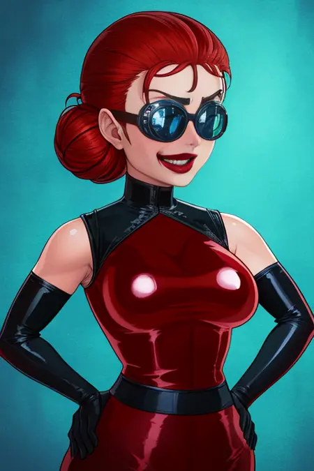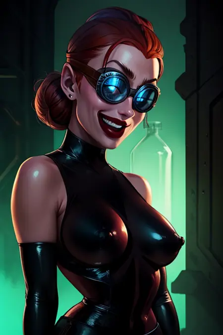 Ghastly, large goggles, red hair ,blue eyes, hair bun, lips,