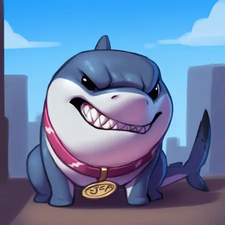 プロンプト: J_tls、サメ、首輪、歯、黒い目、 tail