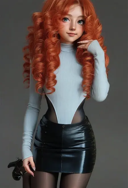 fabric leotard, turttleneck, cloth, long sleeves, sweater, miniskirt, fishnet pantyhose heels,