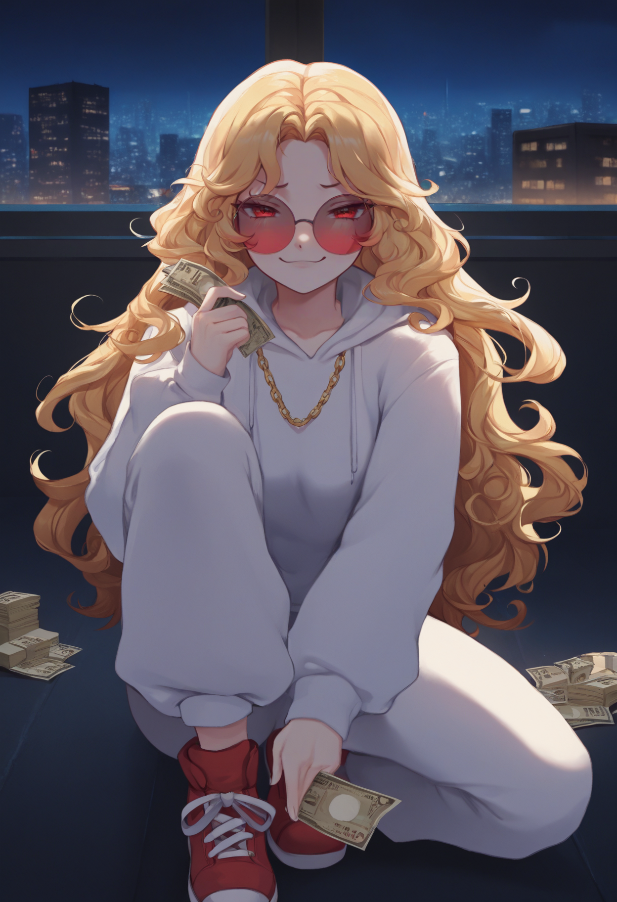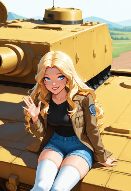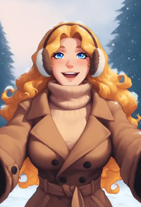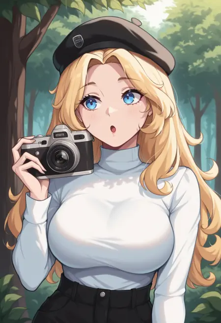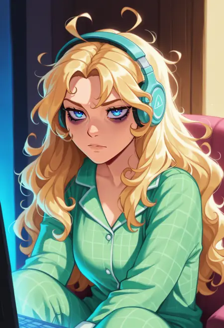 주 프롬프트: "NSHaleyStardew, 긴 머리, 금발, 파란 눈, 물결 모양의 머리"