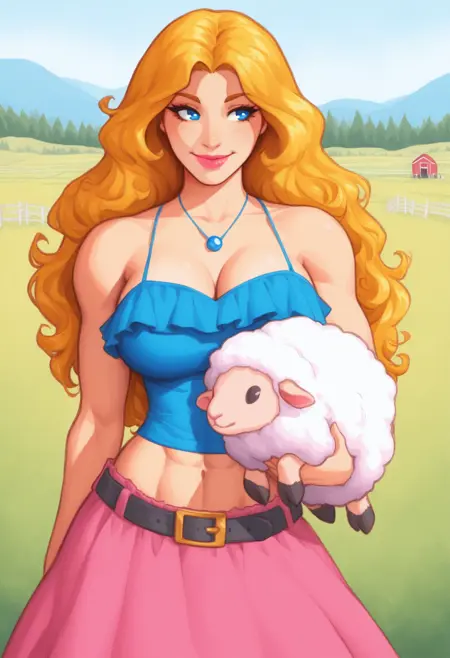 옷차림에는 다음을 사용하세요: "NSHaleyStardew, 긴 머리, 금발, 파란 눈, 물결 모양의 머리, 파란 캄리솔, 프릴이 있는 캄리솔, 분홍 치마, 보석, 어깨 노출, 소매 없음, 목걸이, 벨트, 스파게티 스트랩"