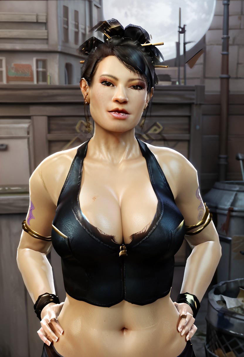 midriff, crop top, cleavage, tattoo, armlett, blue pants, black shoes, standing, solo