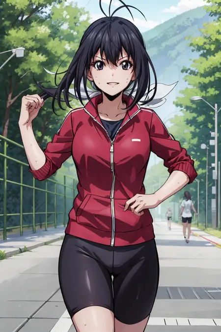 Gym uniform: red track jacket, bike shorts