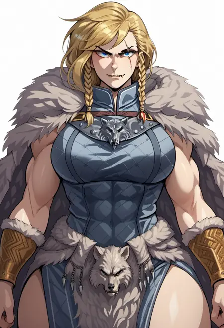 FreyaXL, blonde hair, ponytail, high ponytail, twin braids, scar across eye, blue eyes, fang, breasts, Alternative Hairstyle: blonde hair, wild hair