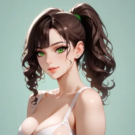추가 고려: (1girl, 귀여움, 짙은 갈색 머리, 중간 길이 머리, 언더 펀치, [파마 머리], 녹색 눈, 귀 천공, 자연스러운 가슴, 큰 가슴, 단단한 가슴, 체격 좋음, 큰 엉덩이, 완벽한 몸매)