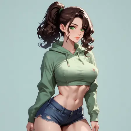 建议添加:(1girl, 可爱, 深棕色头发, 中长发, 马尾, [波浪发], 绿眼睛, 耳钉, 天然乳房, 大乳房, 丰满挺拔的乳房, 健美, 大臀部, 完美身材)