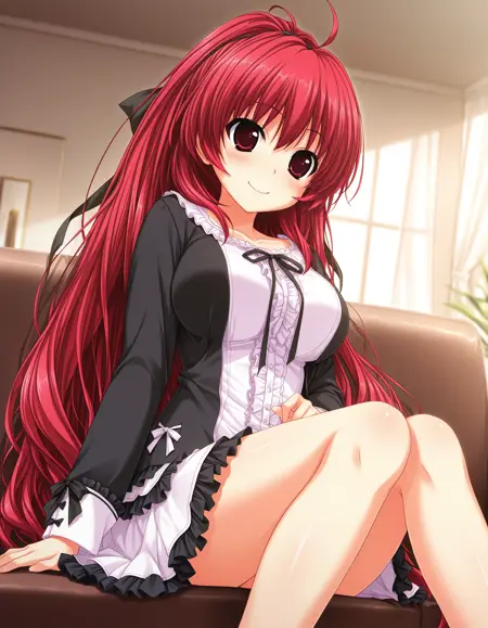 yuutenji mishio, red hair, very long hair, ponytail, hair ribbon, black ribbon, red eyes